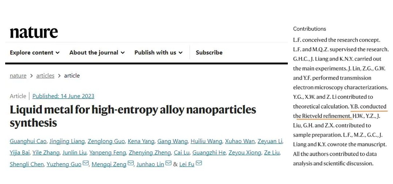 2023年6月16日,国际顶级学术期刊《自然》(Nature)在线发表了武汉大学化学与分子科学学院付磊教授团队关于液态金属的最新研究成果。公司二氧化碳资源化利用自治区高等学校重点实验室白一甲副教授为论文共同作者,采用X射线粉末衍射Rietveld全谱拟合与结构精修的晶体结构分析方法,为该项研究工作提供数据支持。